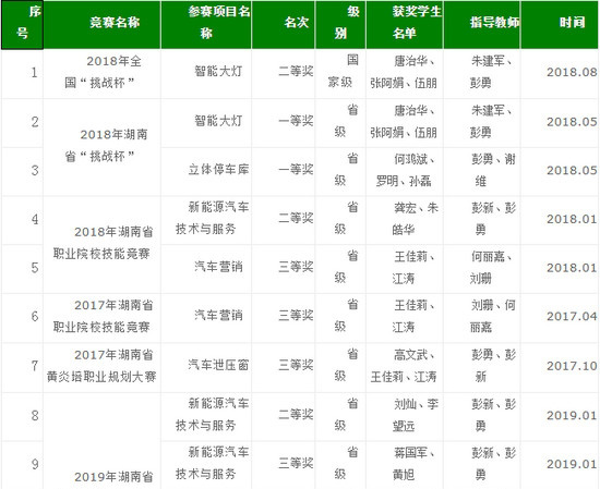 湖南电气职业技术学院先后获得全国机械行业骨干职业院校、全国机械行业校企合作优秀职业院校、全国机械行业合作培养高素质技能人才创新建设学校,湖南电气职业技术学院汽车营销专业近两年学生竞赛主要获奖名单: