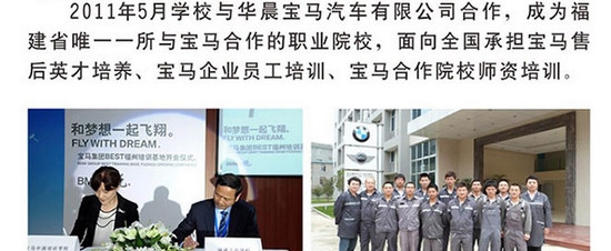 福建工业学校汽车专业教学部成立于2008年,设有省级重点汽车运用与维修专业和汽车制造与检修、车身修复等专业,建有宝马、奔驰、通用、宾士名车会所、中国平安保险等校企合作班和企业员工培训班,是福建省特殊行业定点培训基地,汽车维修工中、高级工鉴定点。2年来,校企共同投资1400多万元,建成宝马培训基地、奔驰培训基地,完善通用实践基地、校办汽车维修厂等。