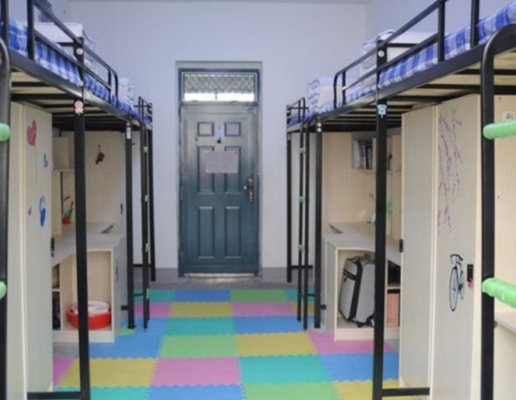 一层楼一个热水供应处。四人间大概30平米(包括阳台卫生间),每个人的独立空间大约8平米。宿舍模型有两种,一种是衣柜附着在书桌旁的,利用空间相对小一些不过很方便,下面的课桌摆书放电脑食物杂物差不多够用,脑袋上方就一张床(宽1.5*长1.8)。另外一种是书桌空间很大,而四个人的衣柜集中在门口的一排呈放,这一型的宿舍就是通风不够好,不一样的是放脸盆桶啊什么的架子在阳台,在室内。现在宿舍已经全面装备了空调,宿舍自己准备打扫工具。