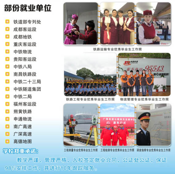 1.报读我校,就业无忧。学校与每一位学生签订就业协议,保障学生充分就业;实行订单式培养,保证学生高质量就业。毕业工作后月平均收入2500元左右,最高月薪可达4000元。学生原则上一年基础课学习,一年技能训练,第三年赴企业顶岗实习,实习期间工资收入超过中专三年的学费。学校与成都铁路局、达成铁路、广州地铁、中石油等大型企业建立了长期合作关系,形成完善的就业网络,近五年毕业生就业率均达98%以上。