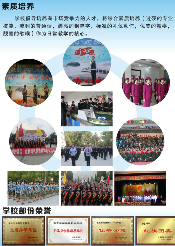 十余年革故鼎新、风雨兼程,南充运输工程职业学校用有为于世的热血倾注,南充运输工程职业学校有信心、有能力办好学校,南充运输工程职业学校有豪情、有壮志承托起社会与时代的厚望。洒出感动时代的人文情怀。唱响“人民教育人民办,办好教育为人民”的赞歌。南充运输工程职业学校将始终坚持“立足铁路,面向交通,服务企业”的办学宗旨,将“给学生提供优质教育,给企业提供最佳服务”作为前行动力,为推动西南地区铁路建设、振兴川东北地方经济作出更大贡献。